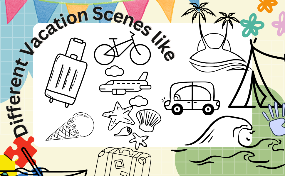 - Variety of Scenes: From beaches and parks to mountains and camping trips, each page presents a different vacation scenario to keep your child engaged and entertained.